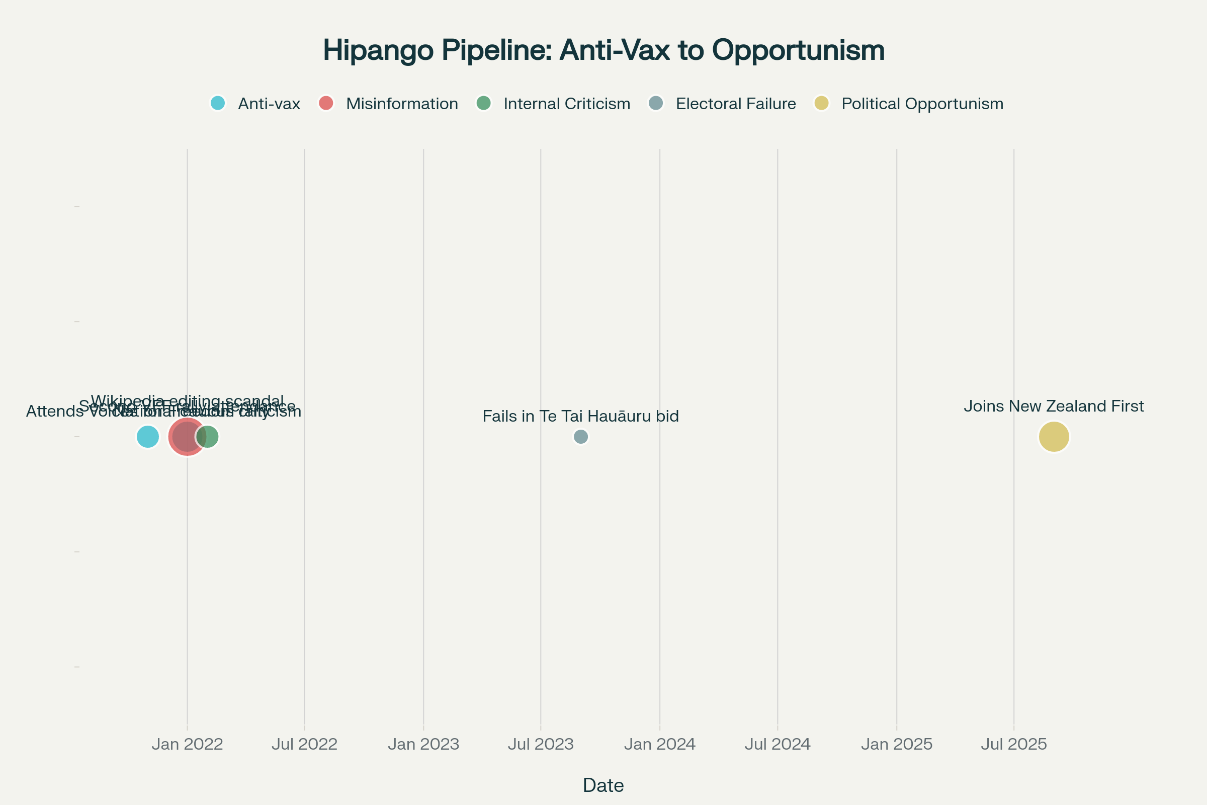 Timeline showing Harete Hipango's progression from anti-vaccination activism to joining New Zealand First