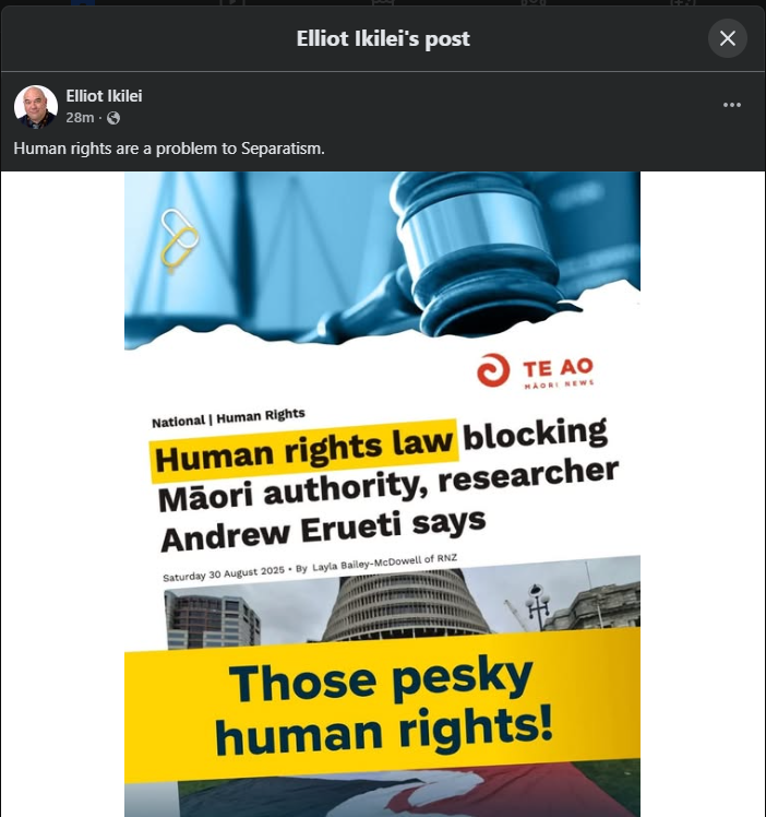 Ikilei’s post relies on a bait‑and‑switch: invoke “human rights” as absolute equality, then equate any Te Tiriti‑grounded remedy with unfair privilege, a move directly called out by Erueti’s research showing how equality talk is repurposed to block Māori authority rather than to protect the minority harmed by colonisation link: RNZ interview with Andrew Erueti on human rights being used to block Māori authority.
