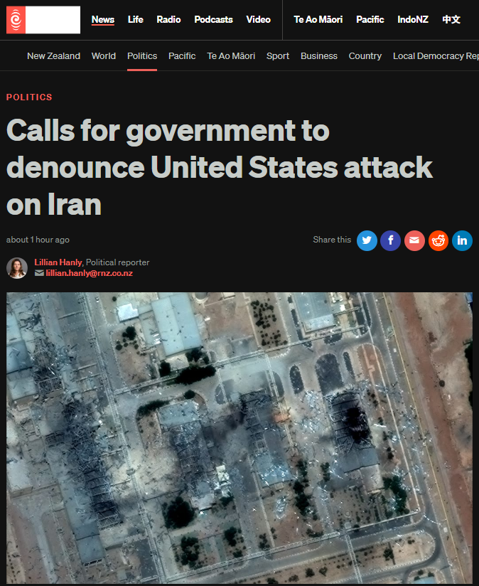 The coalition government's response to the US bombing of Iranian nuclear facilities at Fordow, Natanz, and Isfahan reveals the deep-seated colonial mentality that continues to shape New Zealand's foreign policy (1). When Foreign Affairs Minister Winston Peters issued a statement giving "tacit endorsement" to bombing nuclear facilities while acknowledging the US claim of "collective self-defence consistent with the UN Charter" (1), he demonstrated how settler governments prioritise imperial relationships over international law.