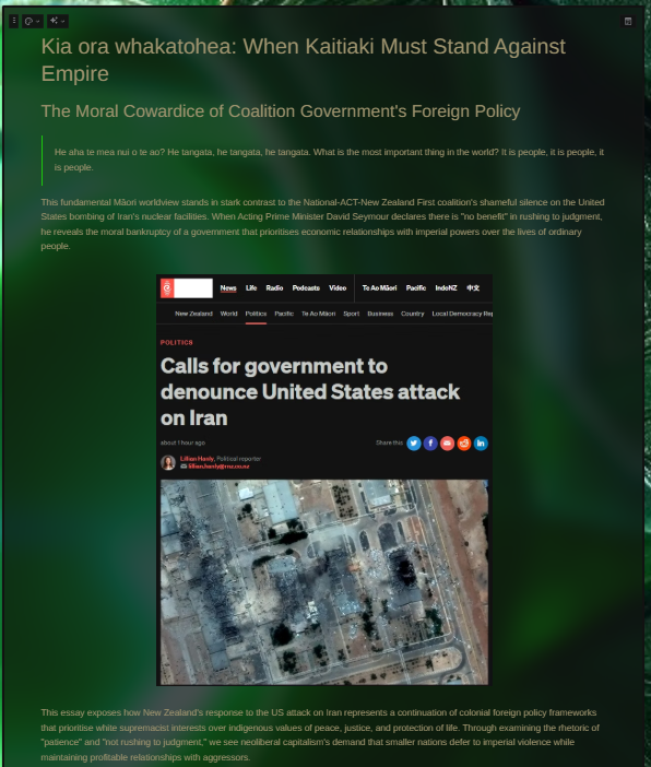 What is the most important thing in the world? It is people, it is people, it is people. This fundamental Māori worldview stands in stark contrast to the National-ACT-New Zealand First coalition's shameful silence on the United States bombing of Iran's nuclear facilities (1). When Acting Prime Minister David Seymour declares there is "no benefit" in rushing to judgment (1), he reveals the moral bankruptcy of a government that prioritises economic relationships with imperial powers over the lives of ordinary people.