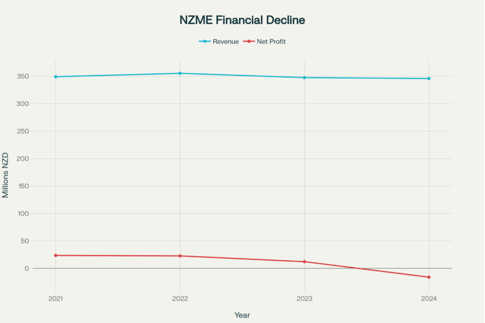 NZME Limited owns the New Zealand Herald, Newstalk ZB, and numerous regional publications. In 2024, NZME reported operating revenue of $345.9 million but a net loss of $16 million after taking a $24 million writedown on publishing assets. Despite claiming to be New Zealand’s “largest media company” reaching “nine in every ten Kiwis,” NZME’s financial performance is declining: net profit fell from $23.6 million in 2021 to negative $16 million in 2024.