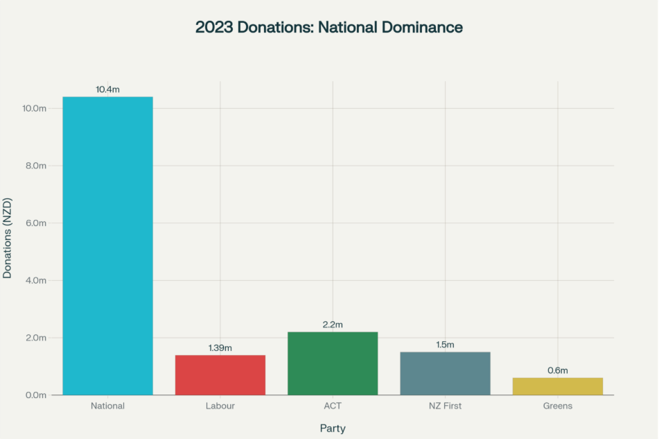 2023 election donations reveal National Party received $10.4 million - 7.5 times more than Labour’s $1.39 million, exposing how corporate wealth floods right-wing parties while working-class interests are systematically underfunded.