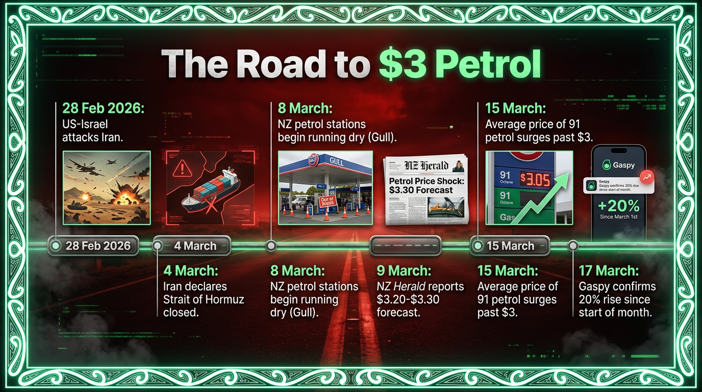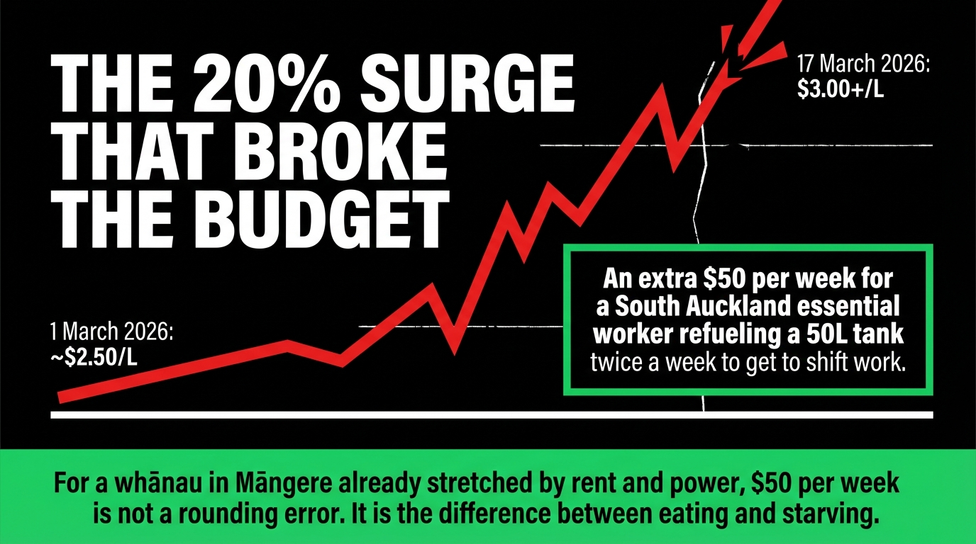 This investigation responds directly to RNZ's report from 17 March 2026, in which Māngere Budgeting Services CEO Lara Dolan warned that the 20% surge in petrol prices this month — now above $3 per litre — will force families to choose between fuel and survival.