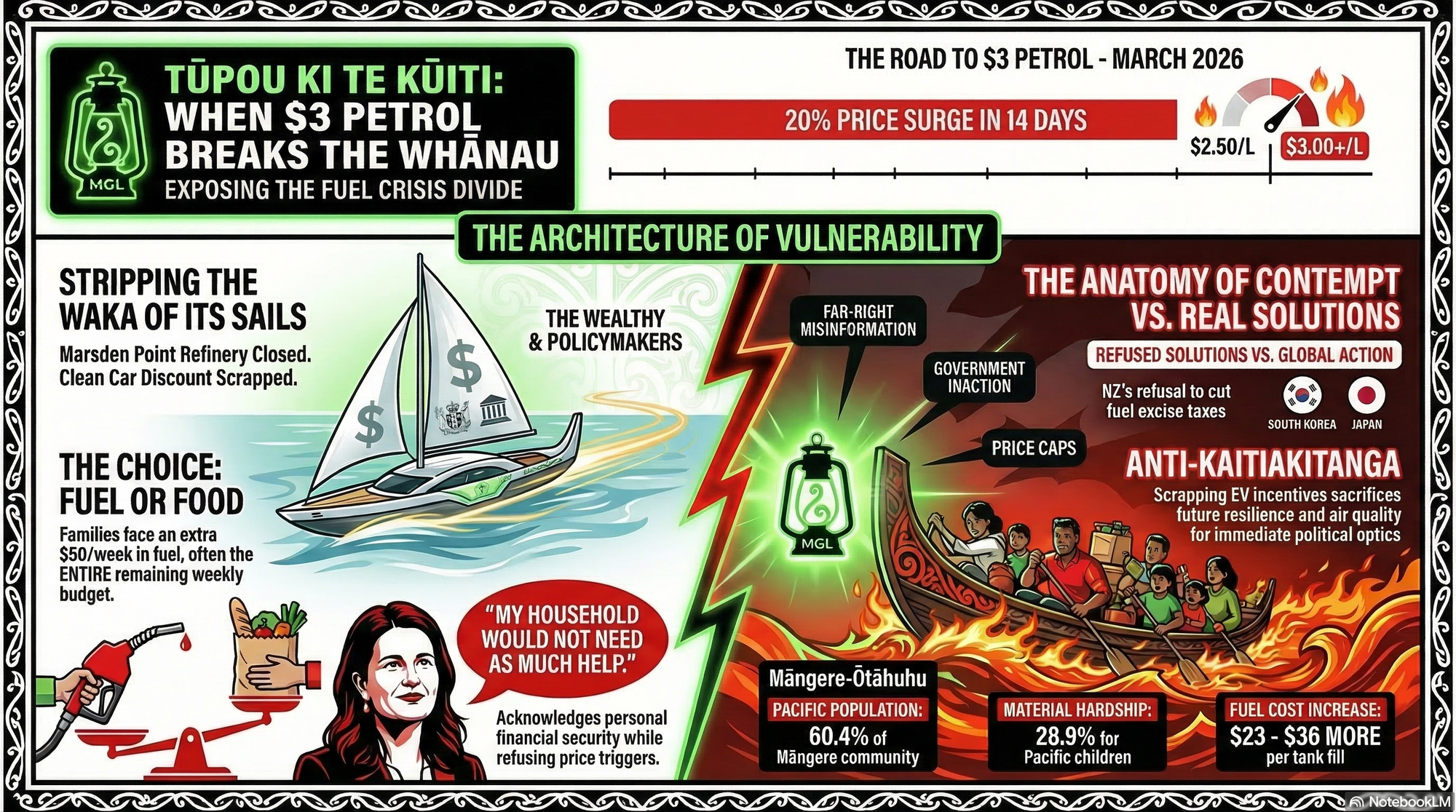 Petrol has hit $3 per litre and is climbing. It has risen 20% in a fortnight, driven by the US-Israeli war on Iran and the closure of the Strait of Hormuz — a route carrying 20% of the world's daily oil supply. For the Māori and Pacific whānau of South Auckland, who have no viable public transport alternative, no electric vehicles, and no financial buffer, this is not an inconvenience. It is a catastrophe. But this government did not just fail to prepare. It systematically dismantled the protections that might have softened the blow: the clean car discount scrapped, the Marsden Point refinery gone, fuel reserves built on paper tickets rather than physical stock, public transport chronically underfunded in South Auckland, and now — the cherry on the cake of contempt — Nicola Willis offering carpooling advice while refusing to commit to a price trigger for action. This essay names what that is: a class war, delivered through fuel prices.