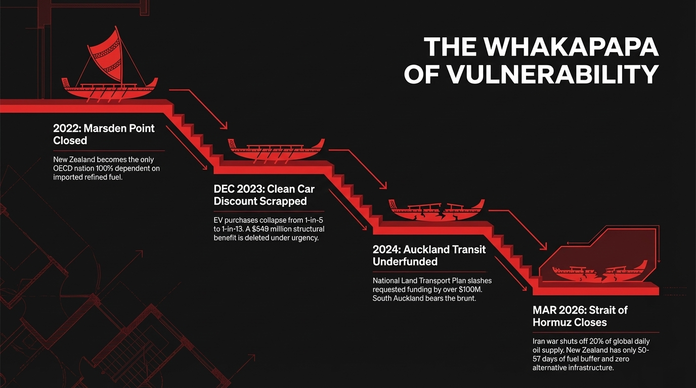 The Point: The structural vulnerability of South Auckland communities to fuel price shocks is not accidental. It is the cumulative result of government choices — the refinery closure, the EV subsidy scrapping, the transport underfunding — that explicitly benefited wealthier, whiter communities and left Māori and Pacific families exposed.