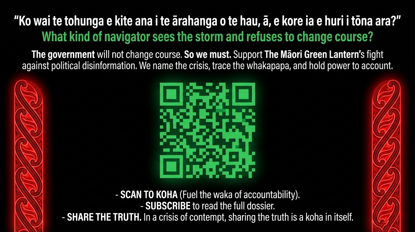 When you koha to the Māori Green Lantern, you are not supporting a media outlet. You are fuelling the waka of accountability. You are ensuring the next crisis — when it comes, and it will come — is named, traced, and placed at the feet of those responsible before the water rises again.