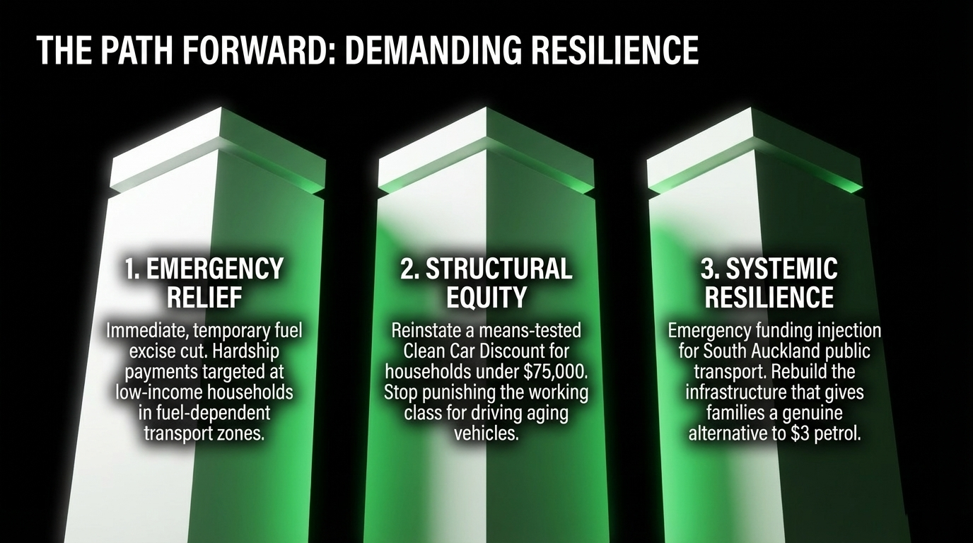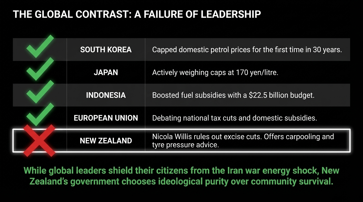The Solution: A temporary fuel excise cut (as implemented in 2022 under Labour), a hardship payment targeted at low-income households in fuel-dependent transport zones, and an emergency injection of funding into South Auckland public transport to reduce dependency on private vehicles. Australia's Labour government cut fuel tax during the 2022 Ukraine-driven price shock. South Korea is capping prices right now. New Zealand can do this. Willis has chosen not to.