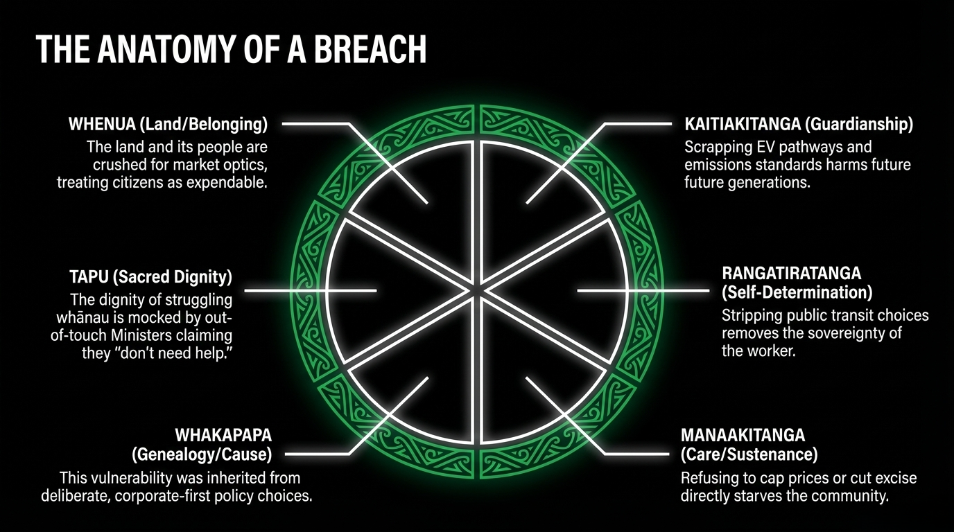The Tikanga Impact: In te ao Māori, kaitiakitanga — guardianship of the natural world and future generations — requires that decisions be made with the long-term wellbeing of mokopuna (descendants) in mind. Scrapping a policy that would have reduced fuel dependency, improved air quality (particularly in South Auckland's already-polluted corridors), and saved money over decades is an act of anti-kaitiakitanga. It sacrifices future resilience for immediate political optics.