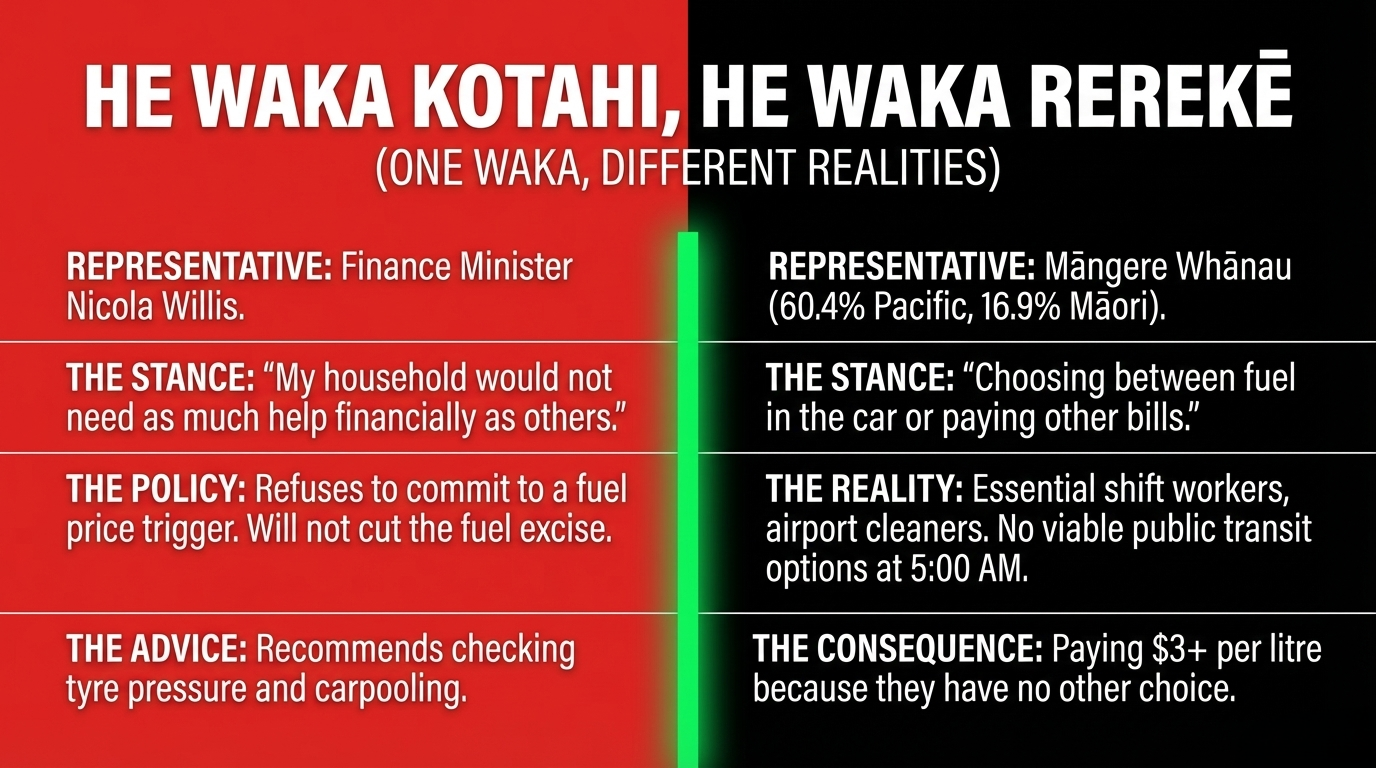 This is not a fuel crisis. This is a revelation. A revelation of who this government serves, who it protects, and who it is perfectly comfortable watching drown in the tide of a cost-of-living catastrophe it helped create. While Finance Minister Nicola Willis admits — with extraordinary candour — that her own household "would not need as much help financially as others," the whānau of Māngere are choosing between petrol and power bills. Between a tank of gas and a plate of food. Between getting to work and staying home. The waka is running dry. But not everyone's waka.