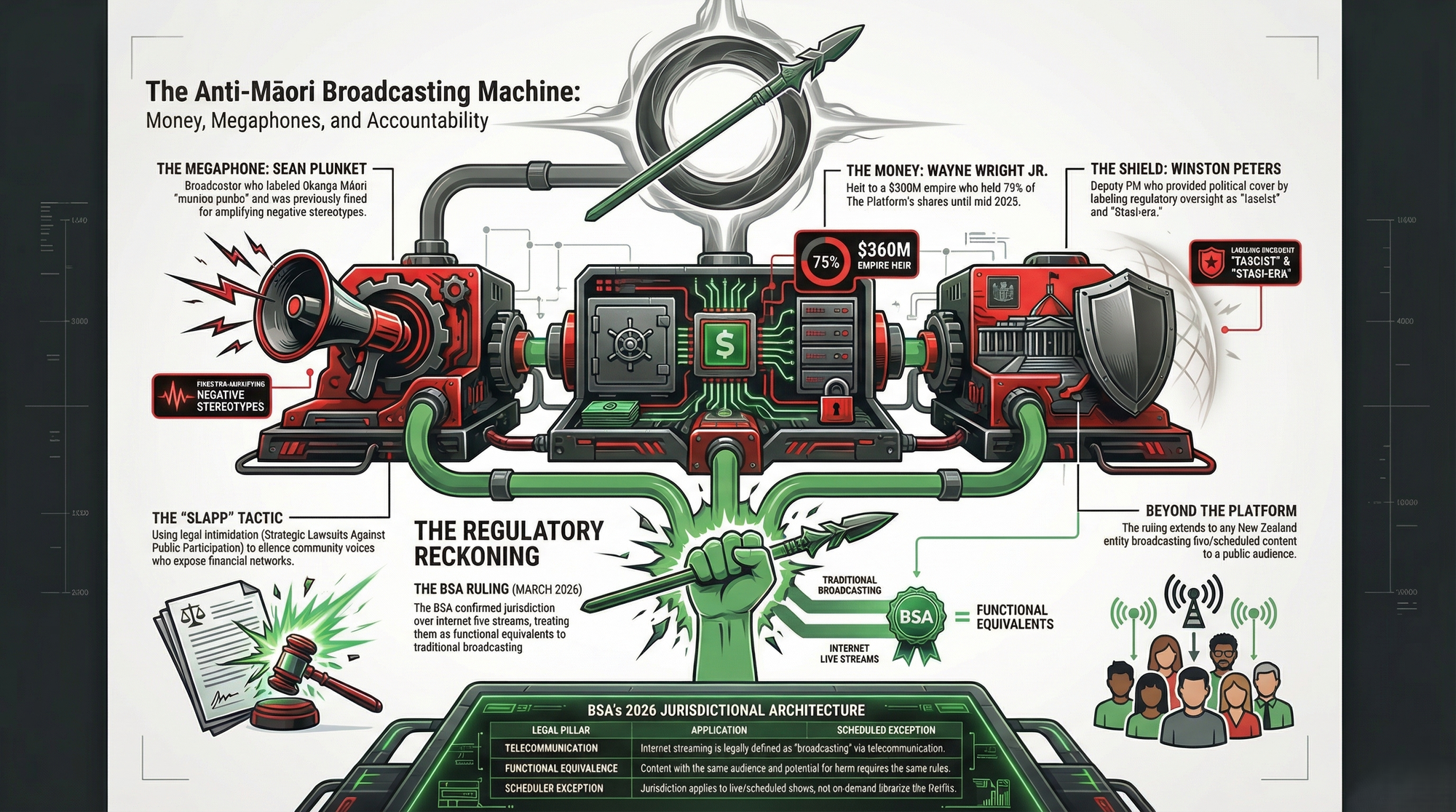 This morning — Good Friday, 3 April 2026 — The Māori Green Lantern published Mumbo Jumbo, Money and Mana: How Plunket, Peters and the Wright Family Built New Zealand's Anti-Māori Broadcasting Machine — and How the BSA Just Lit the Fuse Under It.