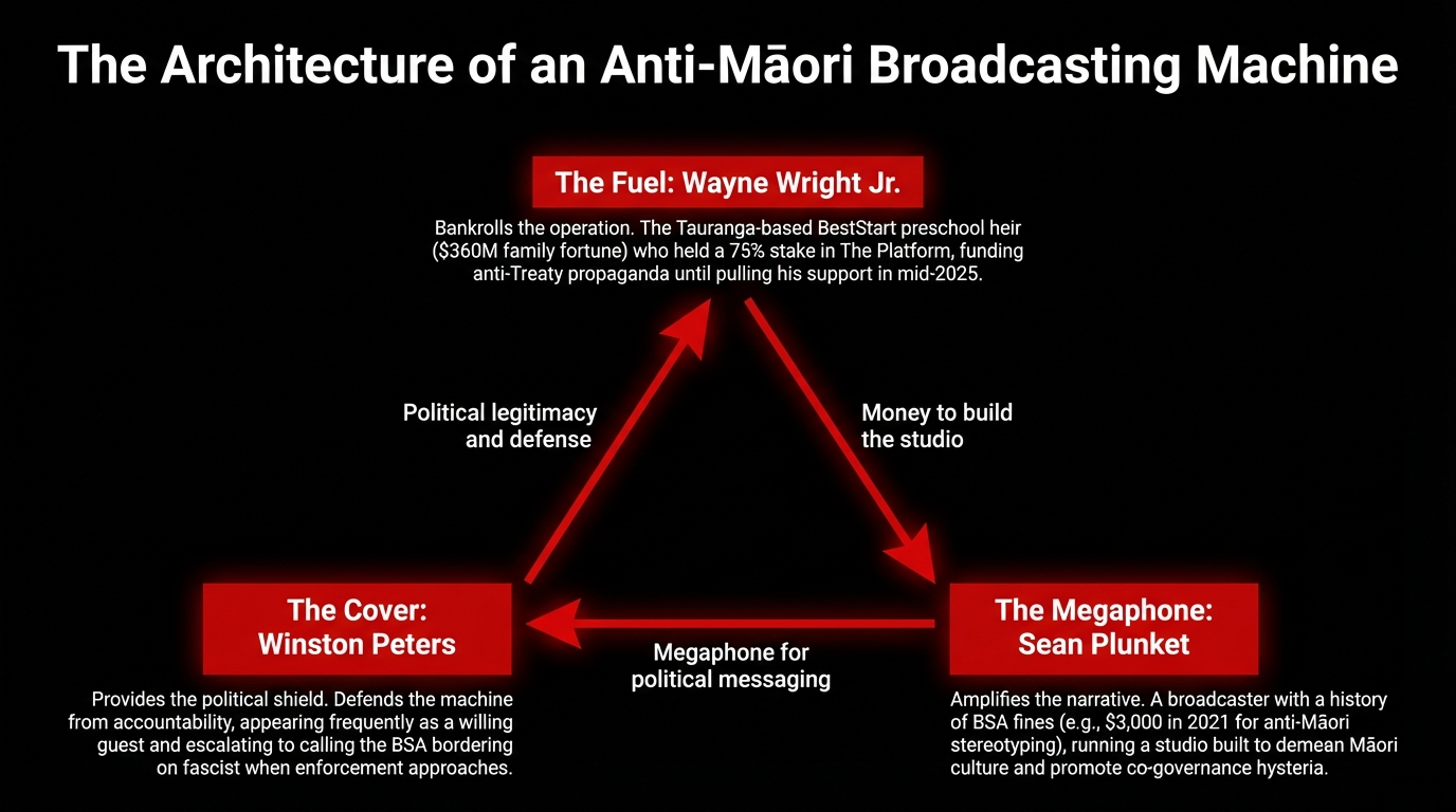 That essay traced, with documented evidence, the financial networks, ideological alliances, and coordinated media machinery behind The Platform — including the Wright family's role as funders, Winston Peters' political air cover, and the Broadcasting Standards Authority's historic decision to claim jurisdiction over Plunket's operation after he described tikanga Māori as "mumbo jumbo" on air on 22 July 2025.
