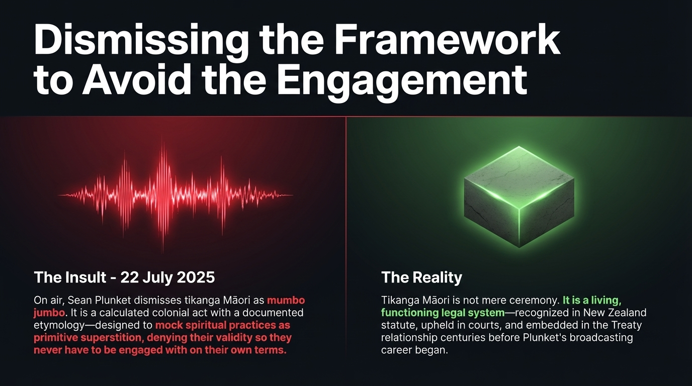 The record is unambiguous. On 22 July 2025, as Chris Lynch Media confirmed, Plunket described tikanga Māori as "mumbo jumbo" on air — dismissing the entire philosophical, cultural and spiritual foundation of tangata whenua in two contemptuous words. When a formal complaint was lodged, Plunket called the complainant a "plonker" and declared The Platform exempt from the BSA because it operated online. When the BSA rejected that position and claimed jurisdiction at the end of March 2026, as NZ Herald's Media Insider reported, Plunket immediately had Winston Peters on air calling the BSA's move "fascist behaviour."