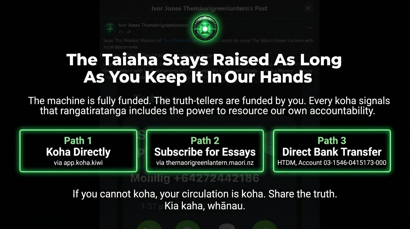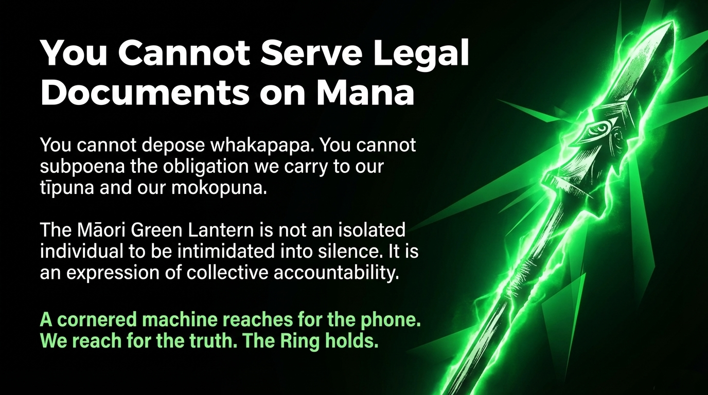 You cannot serve legal documents on mana. You cannot depose whakapapa. You cannot subpoena the obligation we carry to our tīpuna and our mokopuna. The Māori Green Lantern is not an individual to be intimidated into silence — it is an expression of collective accountability that whānau across this motu have chosen to resource and support.
