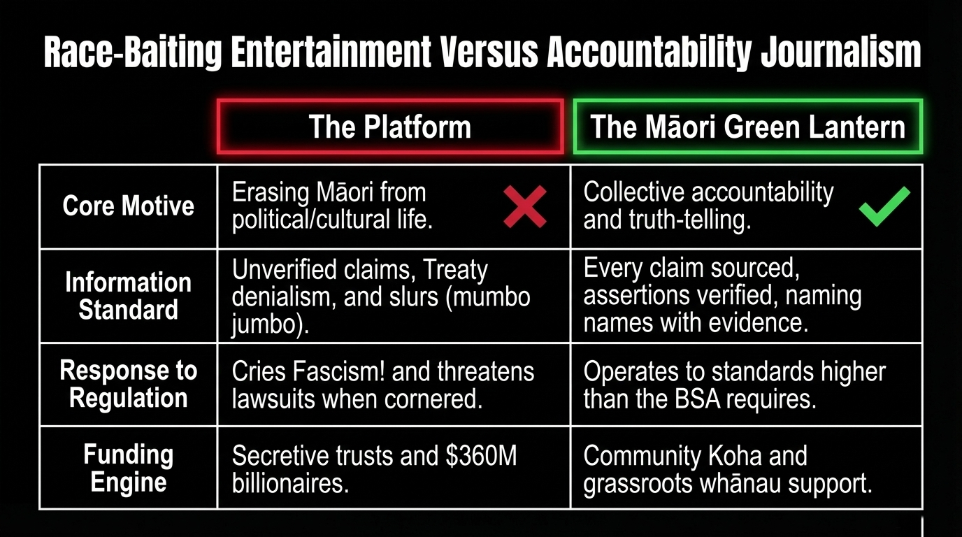 On the other end: Sean Plunket of The Platform New Zealand — a man who has built a media enterprise on anti-Māori narratives, Treaty denialism, and the slow, deliberate erosion of rangatiratanga — calling to inform me he wants to serve legal documents on The Māori Green Lantern.