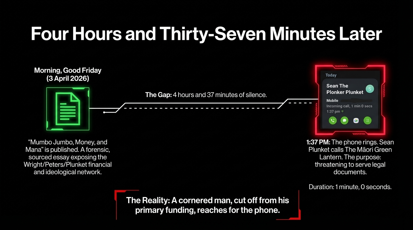 The story of what he did — calling a Māori community voice to threaten legal action on Good Friday, hours after a forensically sourced essay about his conduct went live — stands entirely on its own. It needs no phone number. It needs no embellishment. It needs only to be told clearly, loudly, and on the record.