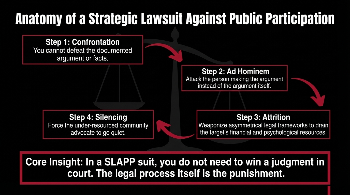 The tactic is simple: when you cannot defeat the argument, you attack the person making it. You do not need to win in court. You only need to make the process so expensive, so exhausting, so psychologically draining, that the truth-teller goes quiet.
