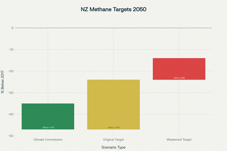 Comparison of New Zealand’s 2050 methane reduction targets showing the government’s weakening from original commitments despite stronger Climate Commission recommendations