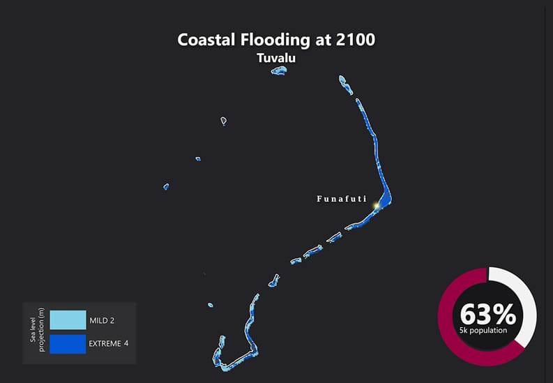 Map of projected coastal flooding in Tuvalu by 2100 highlighting areas affected by 2m and 4m sea level rise and showing 63% of the population at risk.