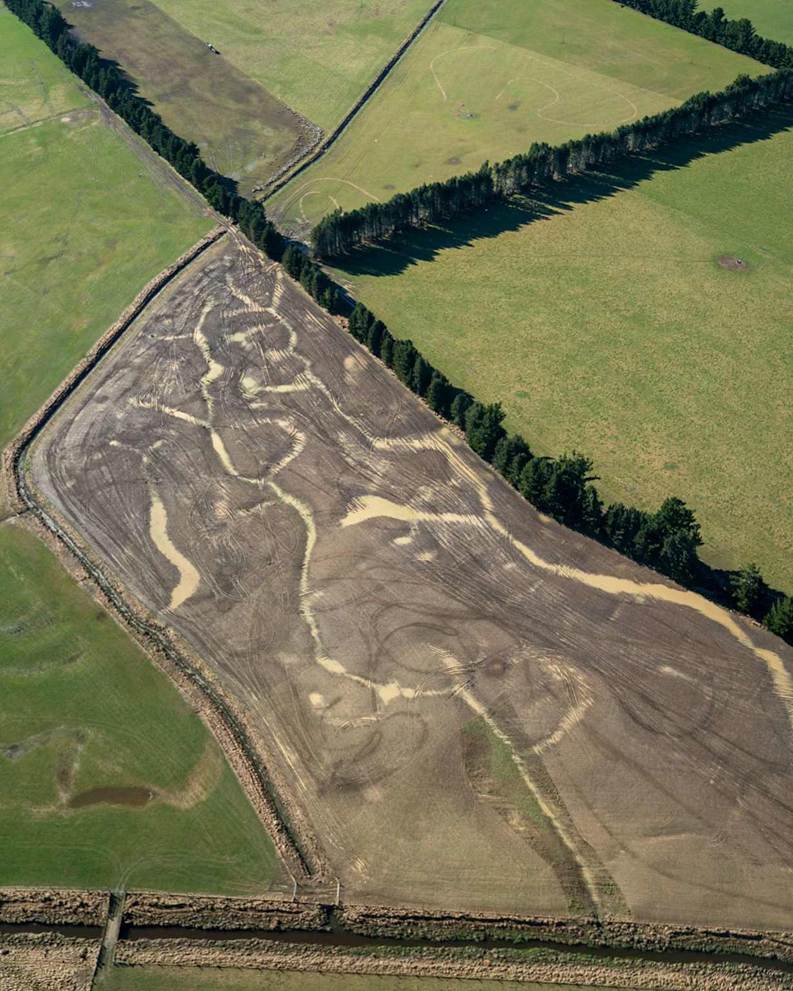 Aerial image showing mud farming and soil degradation caused by intensive dairy farming in New Zealand.