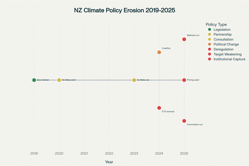 Timeline showing the systematic dismantling of New Zealand’s agricultural emissions policy from the ambitious Zero Carbon Act (2019) to corporate-driven deregulation (2024-2025)