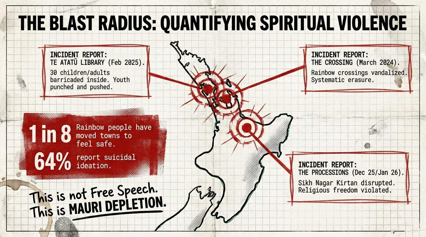 When Destiny attacks Sikh processions, they don’t just harm Sikhs—they fray social cohesion that protects everyone. When they storm libraries terrorizing children, they don’t just traumatize those 30 kids—they make every parent question whether community spaces are safe. When they burn rainbow flags while performing haka, they don’t just hurt rainbow whānau—they corrupt tikanga itself, making future uses of haka suspect.