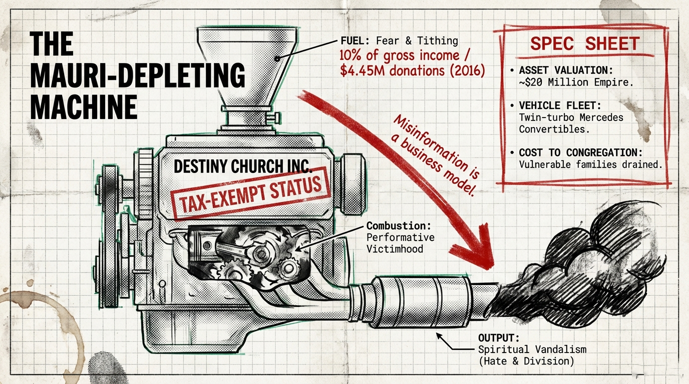 The beneficiary is a $20 million tax-exempt empire that collects 10% of members’ incomes as mandatory tithes, that received $4.45 million in donations in 2016 alone, that finances twin-turbo Mercedes convertibles while telling parishioners that giving “thousands of dollars should be normal.” The beneficiary is a political movement masquerading as a church, leveraging fear and division to grow its influence while Aotearoa’s most vulnerable suffer.