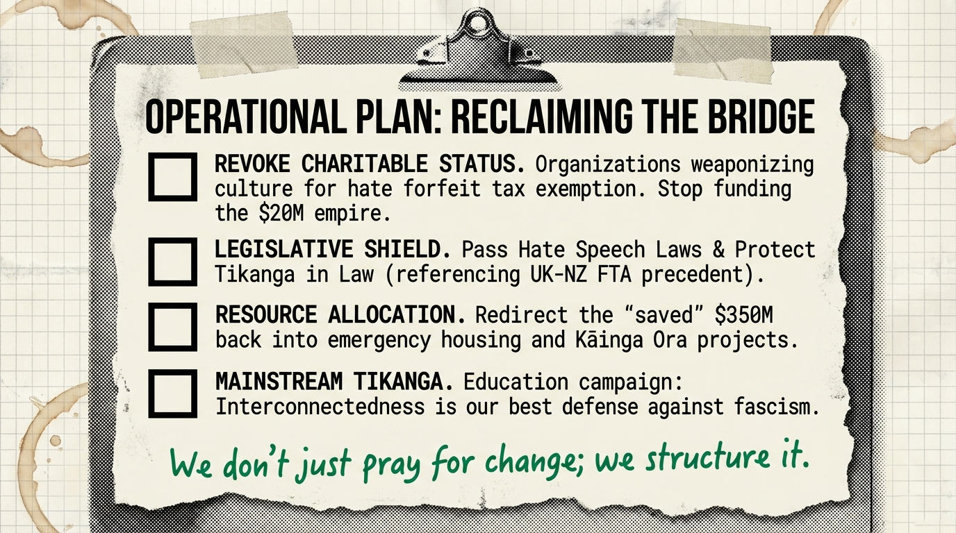 This essay exposed what $20 million in tax-exempt silence looks like. While Destiny Church sits on an empire built from mandatory tithes and weaponizes our taonga (haka, taiaha, moko) to spread hate, whānau experiencing homelessness are denied the $350.5 million the Crown “saved” by cutting emergency housing.