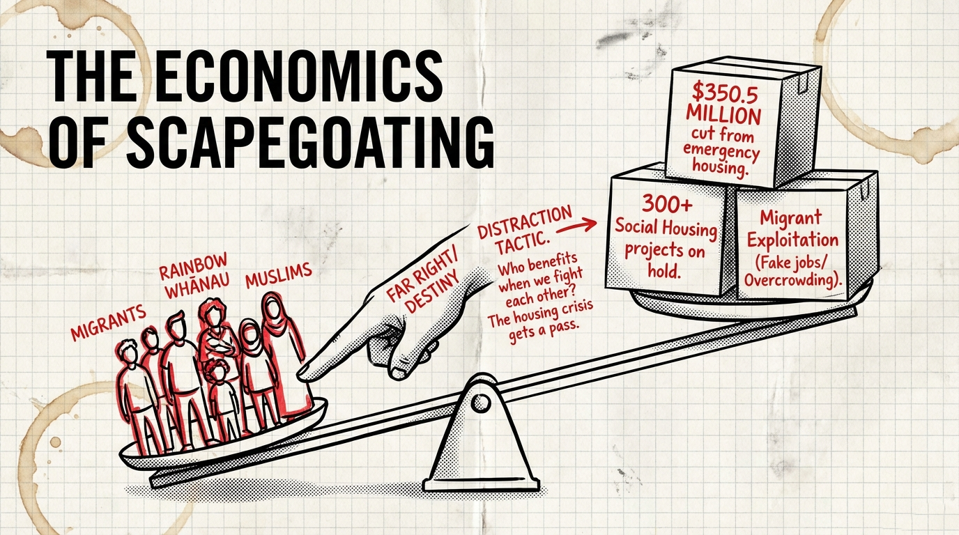 The real crisis is housing unaffordability, wage stagnation, insecure work, migrant exploitation. Fascists like Tamaki exploit economic anxiety by redirecting rage toward scapegoats: migrants, rainbow communities, other faiths. The antidote is economic security. Tax wealth. Build public housing. Guarantee livable wages. When people have material security, culture war grifters lose their audience.