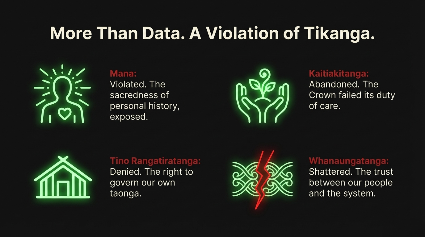 Kaitiakitanga: The Crown failed its kaitiaki duty to protect Māori health data. No Māori governance or oversight existed when the breach occurred. Corporate custodianship failed, with no Māori-controlled backup systems to honor data sovereignty.