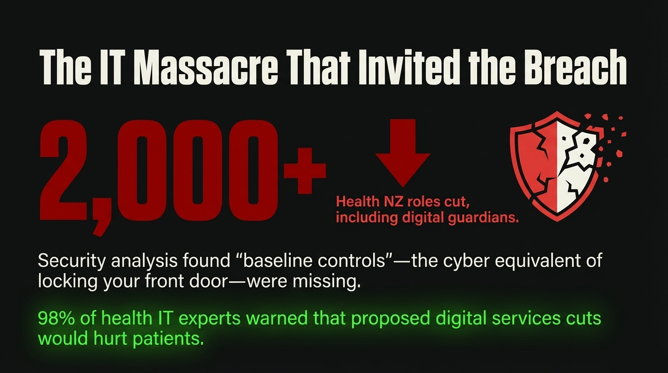 The Public Service Association’s National Secretary Fleur Fitzsimons asked the question that cuts to the bone: “Where was this vigilance when his administration was reducing the Digital Services team at Health NZ?” as quoted by RNZ and echoed in the Otago Daily Times. Health NZ was forced to cut more than 2,000 roles including the IT experts whose job was safeguarding patient information, as documented by RNZ. This occurred despite the 2021 Waikato DHB ransomware attack that should have served as a “wake-up call,” and an anonymous tip in June 2025 warning that ManageMyHealth had exposed names, emails, and passwords, as reported in the NZ Herald’s security analysis.