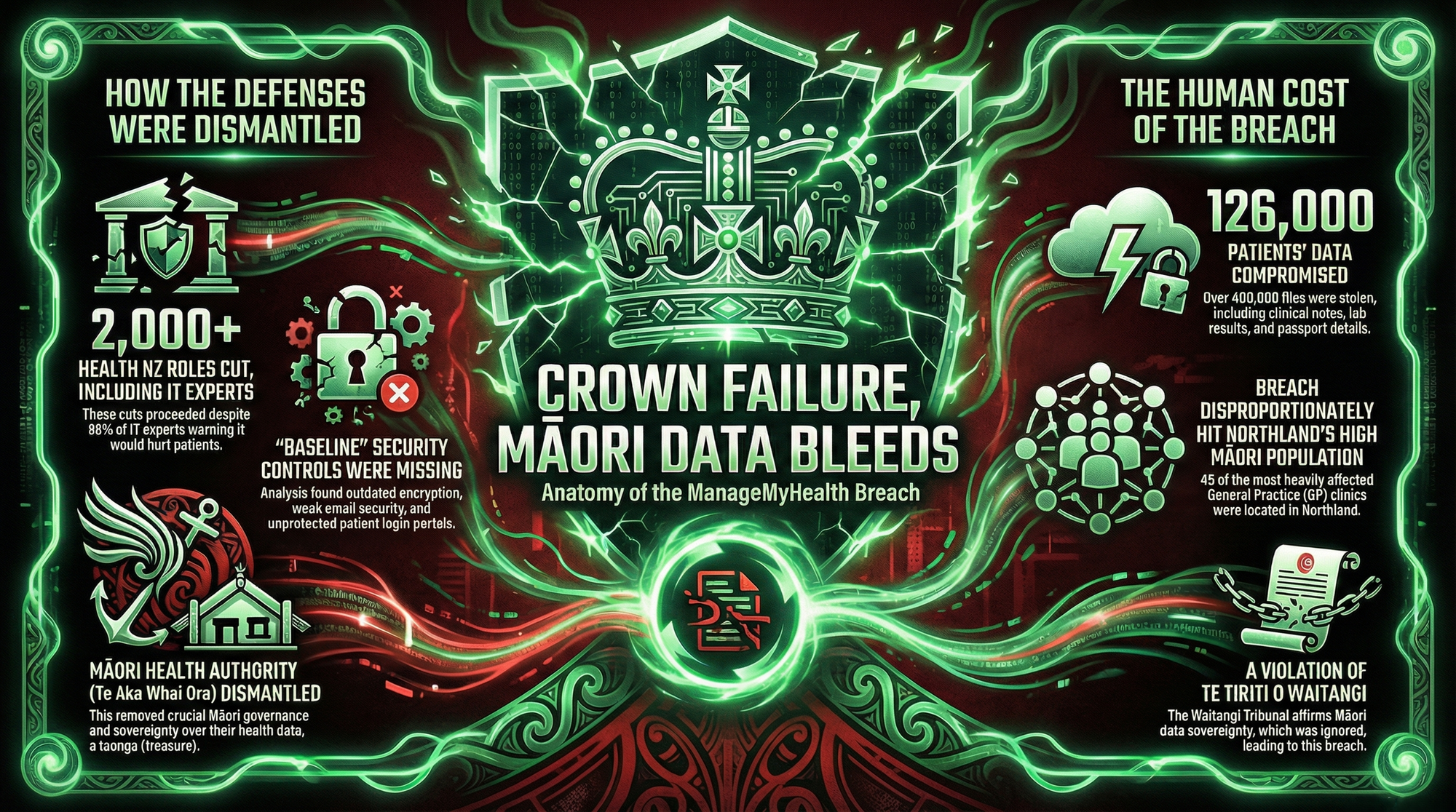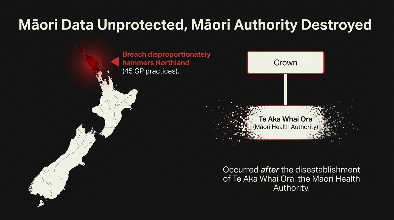 126,000 New Zealanders—disproportionately Māori from Northland—now live with the knowledge that their most intimate health secrets are traded on criminal markets. Not because the hack was sophisticated, but because the government systematically destroyed the expertise meant to prevent it while dismantling Māori health authority guaranteed under Te Tiriti.