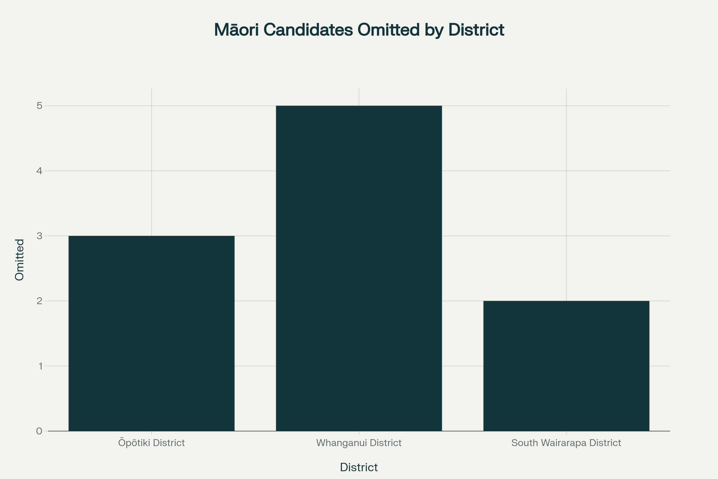 Chart showing the systematic omission of Māori ward candidates from official voting materials across three New Zealand districts in 2025