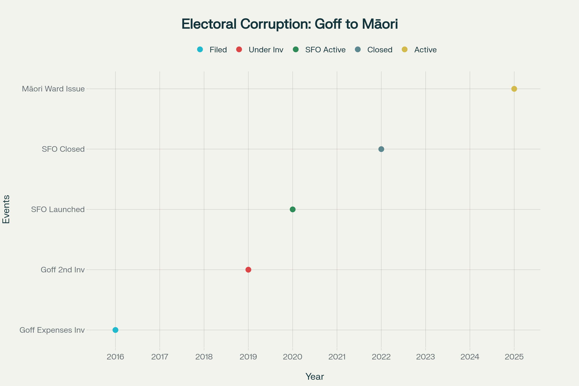 Timeline showing the pattern of electoral corruption and misconduct in New Zealand from 2016 to 2025