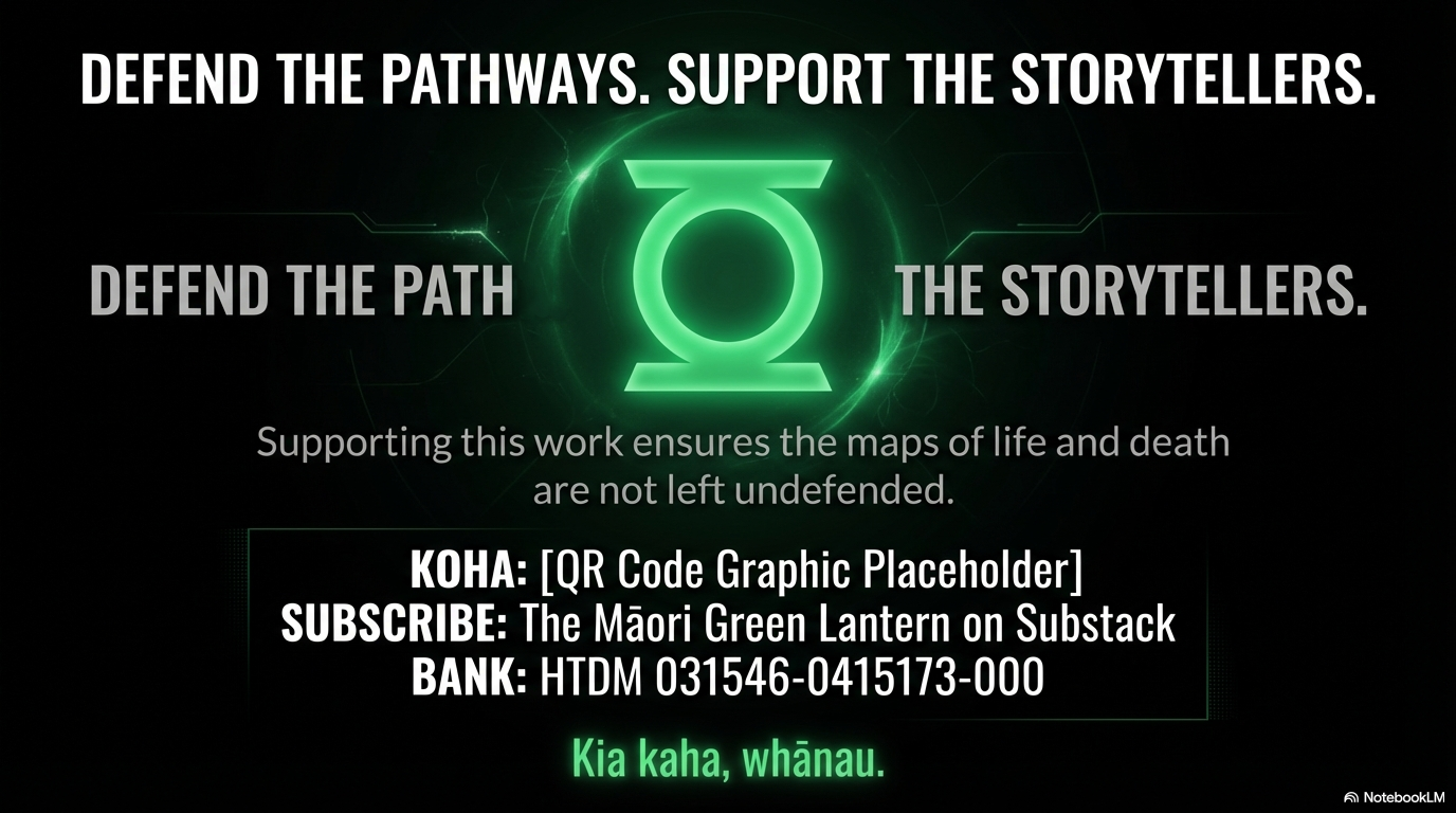 If you are unable to koha, kei te pai — subscribe or follow The Māori Green Lantern on Substack, kōrero about these ideas at your own tables, and share with your whānau and friends. That is koha in itself.
