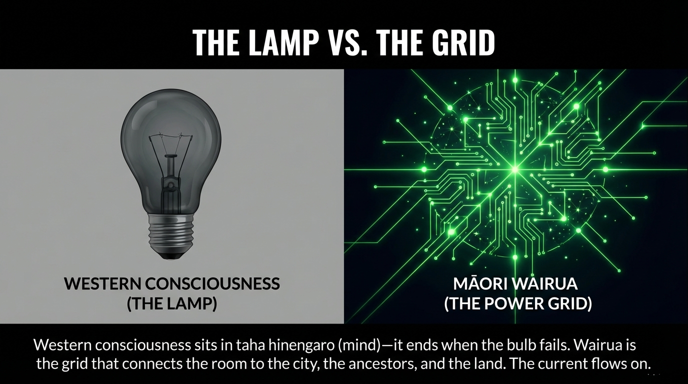 You might think of consciousness as the lamp in one room, and wairua as the power grid that connects that room to an entire city. At death, the lamp goes out. But in te ao Māori, the grid does not. The current flows on — along Te Ara Wairua, toward the ancestors.