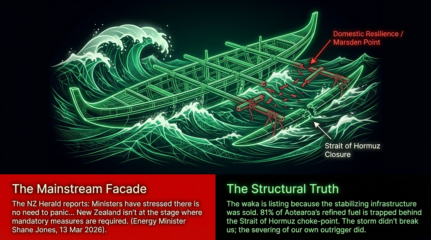 Te Pāti Māori and The Māori Green Lantern saw this coming. As documented in Trump's Iran War — When a Nuclear-Free Nation Genuflects Before the Bombs, MFAT's own analysis warned that Strait of Hormuz disruption would "push the price of fuel and inflation higher" — and this government chose silence over preparation, diplomatic cowardice over sovereign courage.