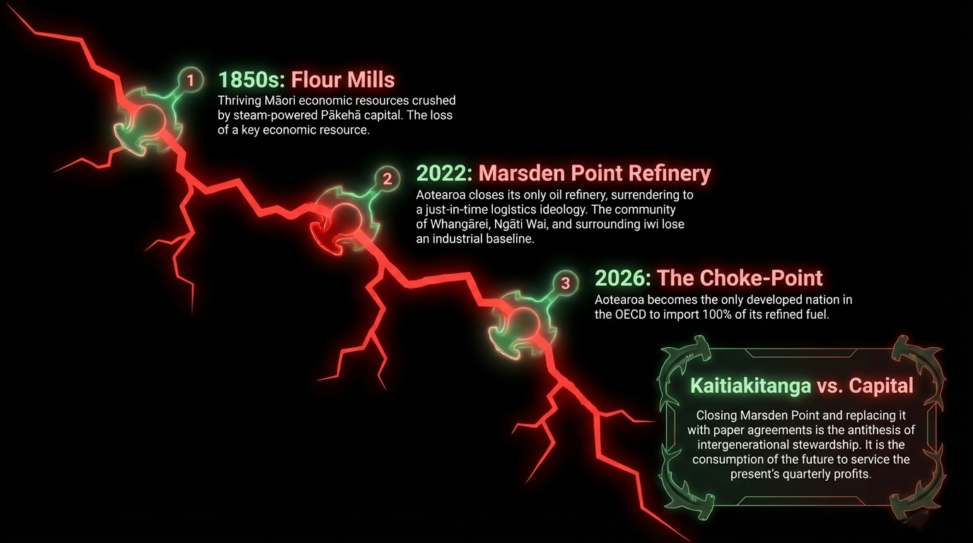 As Te Ara documents the pattern of Māori economic dispossession, Māori have seen this before: "The loss of land meant the loss of a key economic resource for Māori." In the 1850s it was flour mills crushed by steam-powered Pākehā capital. In 2022 it was a refinery surrendered to "just-in-time" logistics ideology. The mechanism is identical. Only the century changes.