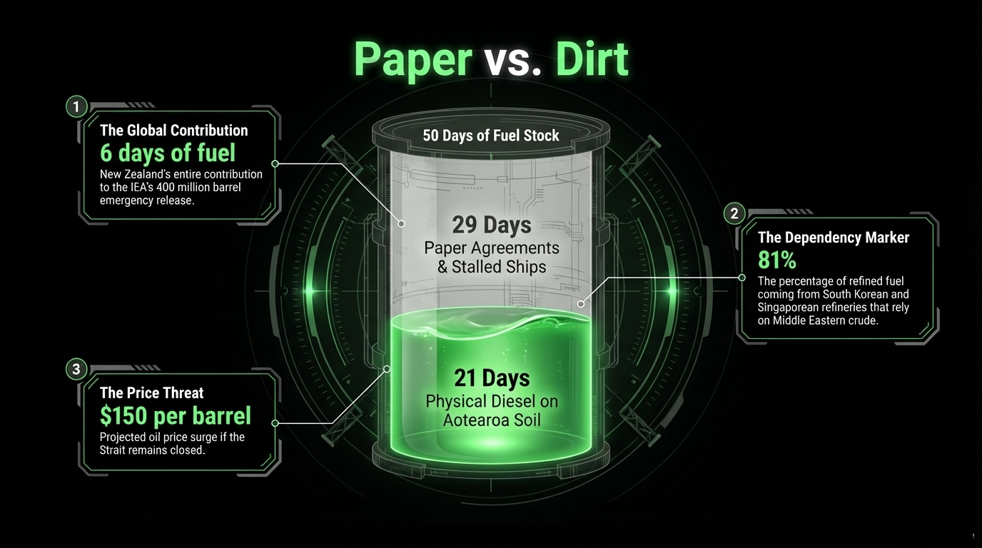 New Zealand sits on approximately 21 days of physical diesel reserves, with the increase to 28 days not scheduled until July 2028, as Carbon News reveals. The government's reassurance of "more than 50 days of fuel stock" includes fuel already on ships — ships now subject to Force Majeure declarations cascading through the supply chain. The remaining reserves exist largely as paper agreements with overseas governments — untested financial instruments dressed up as physical security.