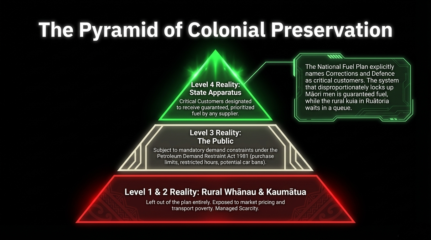 Read those levels again. At Level 2, the "critical customers" who get guaranteed fuel are Corrections — the same system that locks up Māori men at rates The Nursery of Cages documents as a factory of colonial punishment. The same system gets guaranteed fuel while the rural kuia in Ruātoria waits in a queue. This is not emergency planning. This is the colonial hierarchy encoded into petroleum law.
