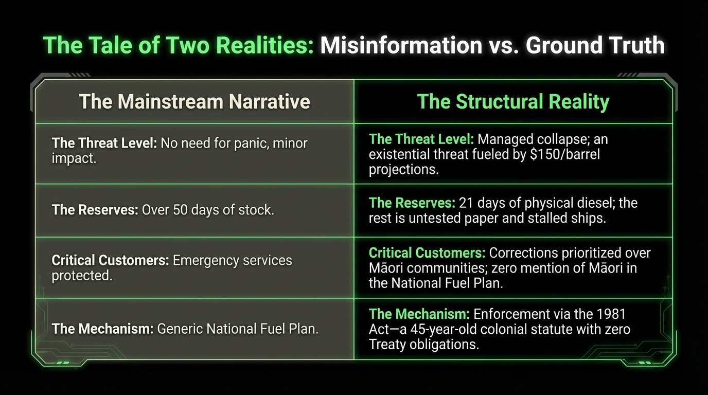 The fuel crisis follows this pattern exactly. The crisis was manufactured by decades of neoliberal energy policy. The report is the National Fuel Plan — a "relatively generic" document that names Corrections as a critical customer and does not mention Māori once, as NZ Herald confirms. The economic urgency is real — analysts project $150/barrel oil per 1News reporting. And the communities who will bear the cost are, as always, those at the bottom of the "critical customer" hierarchy.