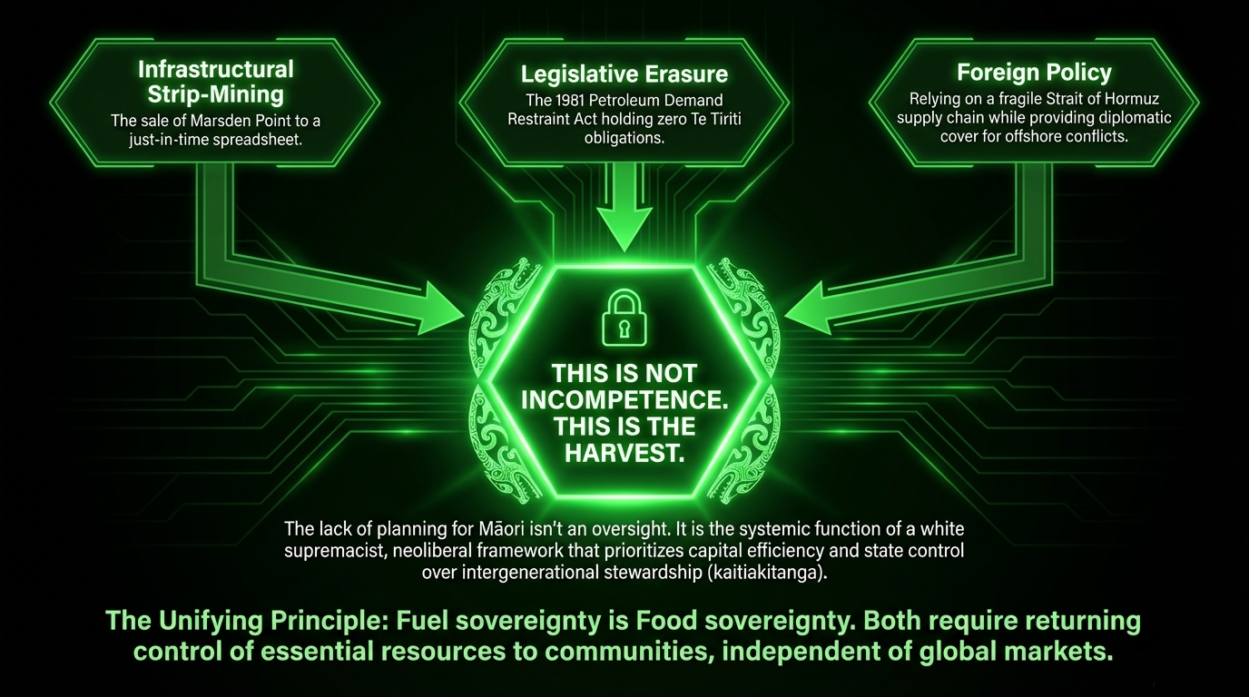 5. Food Sovereignty and Fuel Sovereignty Are the Same Kaupapa. As Foundation North's food sovereignty research documents, Māori food sovereignty "puts Māori who produce, distribute and consume food — rather than the demands of global markets — at the heart of food systems." Fuel sovereignty is the same principle applied to energy. Both have been stripped. Both must be rebuilt. Neither requires permission from Shane Jones to begin.