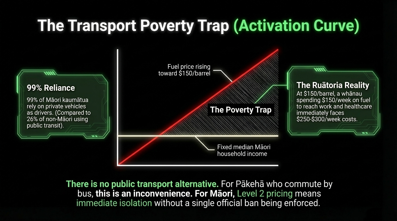 At $150/barrel — as analysts project via 1News — a Māori whānau in Ōpōtiki spending $150/week on fuel to reach work, healthcare, and kura will face costs of $250–$300/week minimum. There is no public transport alternative. There is no government plan for them.