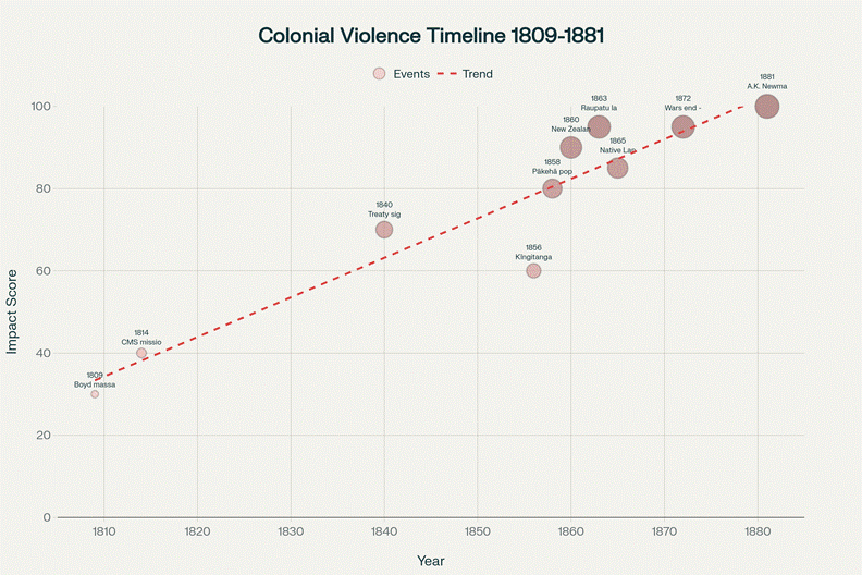 The systematic escalation of colonial violence from the Boyd massacre through missionary infiltration, Treaty deception, demographic inversion, war, and mass land theft, culminating in genocidal declarations.