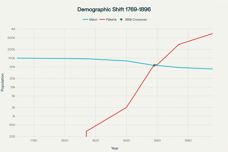 The critical turning point that O’Malley identifies is 1858, when the Pākehā population exceeded the Māori population for the first time. This was not coincidental timing. The demographic shift was the result of deliberate policy. In 1840, when Te Tiriti o Waitangi was signed, the ratio of Pākehā to Māori was approximately one to forty. By 1860, the groups had reached parity. By 1874, Māori were less than one-tenth of the national population. This was demographic warfare.