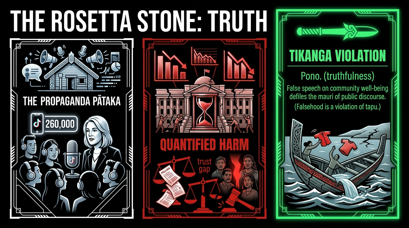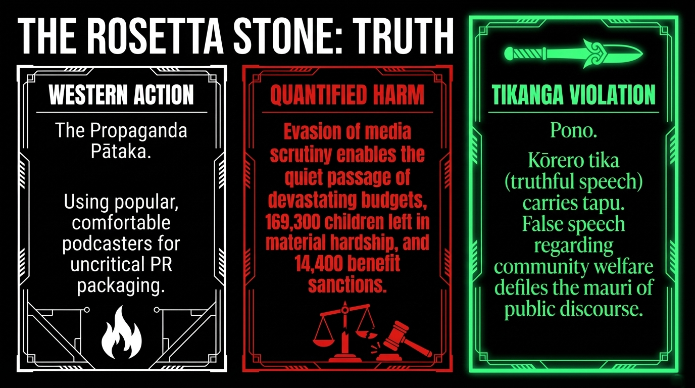 The tikanga dimension: Pono — truth, integrity, alignment between word and action — is not a nice-to-have in te ao Māori. It is the foundation of all mana. A community cannot navigate by a star that lies about its position. A people cannot make decisions with information that has been filtered through the spouse's emotional lens on a podcast sponsored by a KiwiSaver provider. The Māori concept of kōrero tika — truthful speech — carries the weight of tapu. To speak falsely about matters of community welfare is not just dishonest. It is a defilement of the mauri of public discourse. This podcast did not accidentally omit hard questions. It was designed to omit them.
