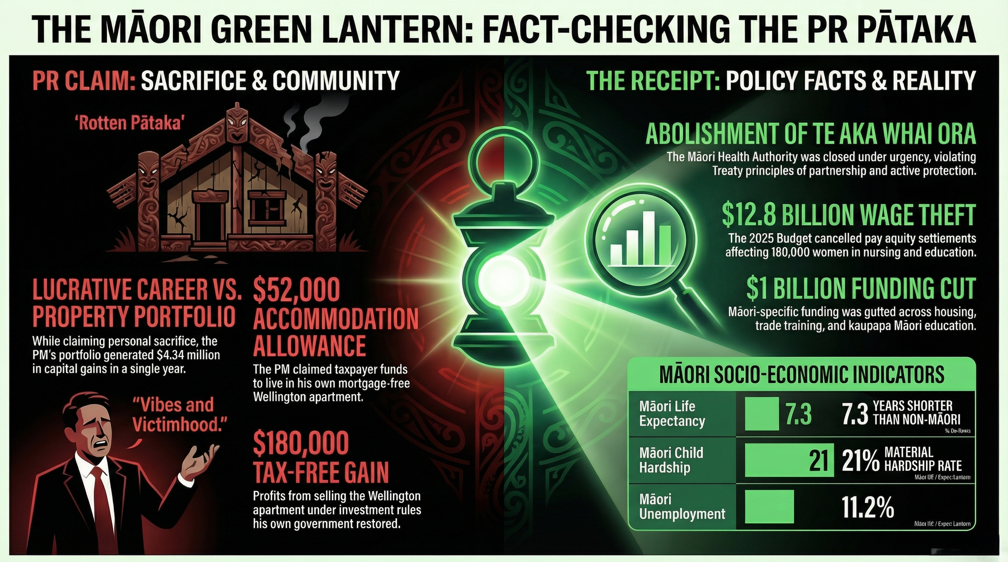 The quantified harm: Every week Luxon's government escapes meaningful media scrutiny, another Budget passes. Another programme is cut. Another Waitangi Tribunal finding is dismissed. Another 14,400 benefit sanctions fall. As The Māori Green Lantern documented in The Traffic Light Taiaha, Māori unemployment sits at 11.2 percent — a figure this government refuses to connect to its own dismantling of Māori employment infrastructure.