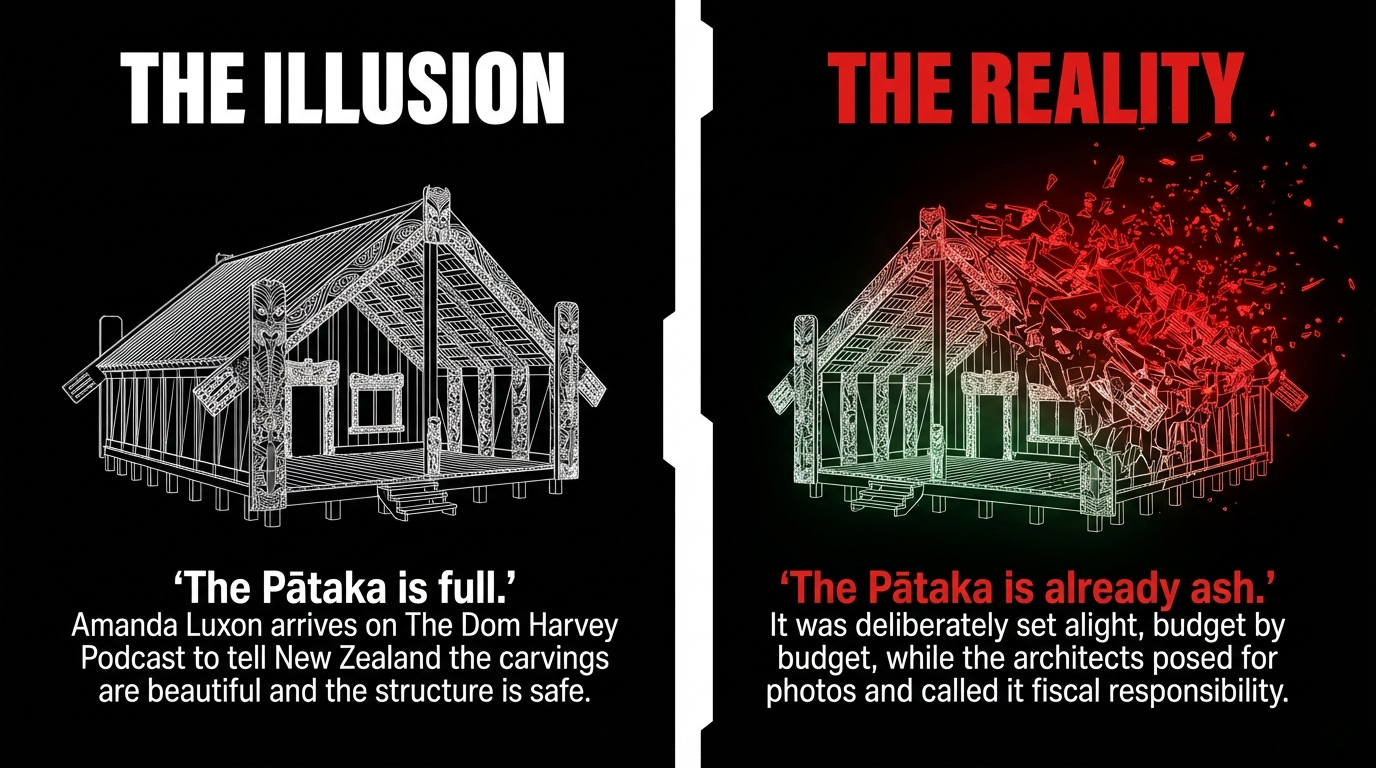 As previously documented in The Pātaka is Ash: How Nicola Willis and Christopher Luxon Poured Petrol on the Poor, the structure was not accidentally damaged. It was deliberately set alight, policy by policy, Budget by Budget, while the architects posed for photographs in front of the smoke and called it "fiscal responsibility."
