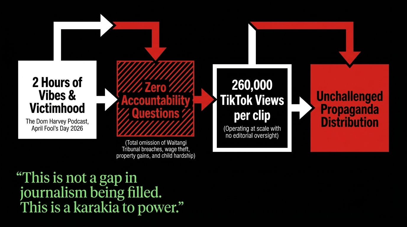 The solution: Fund independent Māori media. Demand public accountability standards for podcast platforms with political content. Legislate media ownership transparency. Read, share, and support accountability journalism that asks the questions Dom Harvey will not.