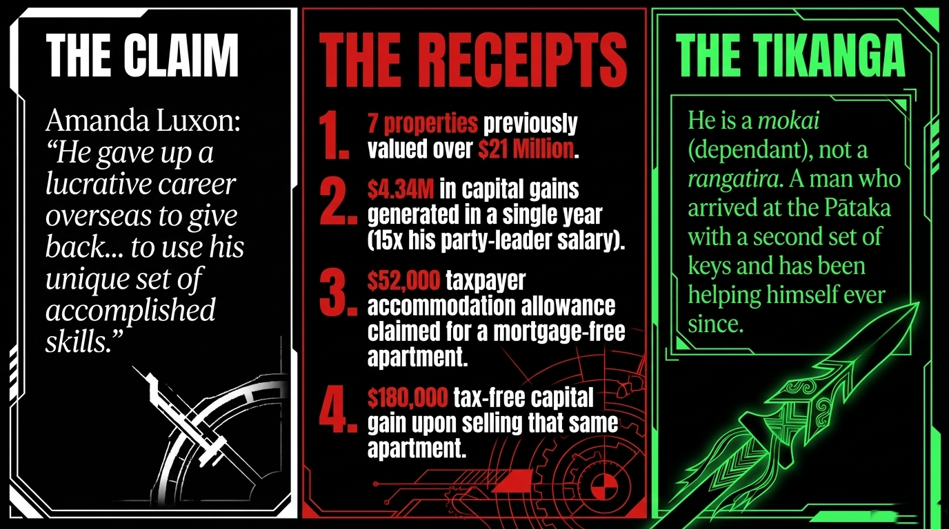 Christopher Luxon owned seven properties valued at over $21 million, as confirmed by 1News in June 2023. In a single year before entering politics, his property portfolio generated $4.34 million in capital gains — approximately 15 times his then-party-leader salary, as documented by The Kākā. Upon becoming Prime Minister, he claimed $52,000 per year in taxpayer accommodation allowance to service his own mortgage-free Wellington apartment — a move exposed in devastating detail by The Spinoff. He then sold that apartment under investment property rules his own government restored — banking a $180,000 tax-free capital gain, documented in The Māori Green Lantern's Property Baron's Pipe Dream. As at May 2025, he has sold properties down to three — but only after the political heat became untenable, as confirmed by the NZ Herald MPs' property portfolios disclosure.