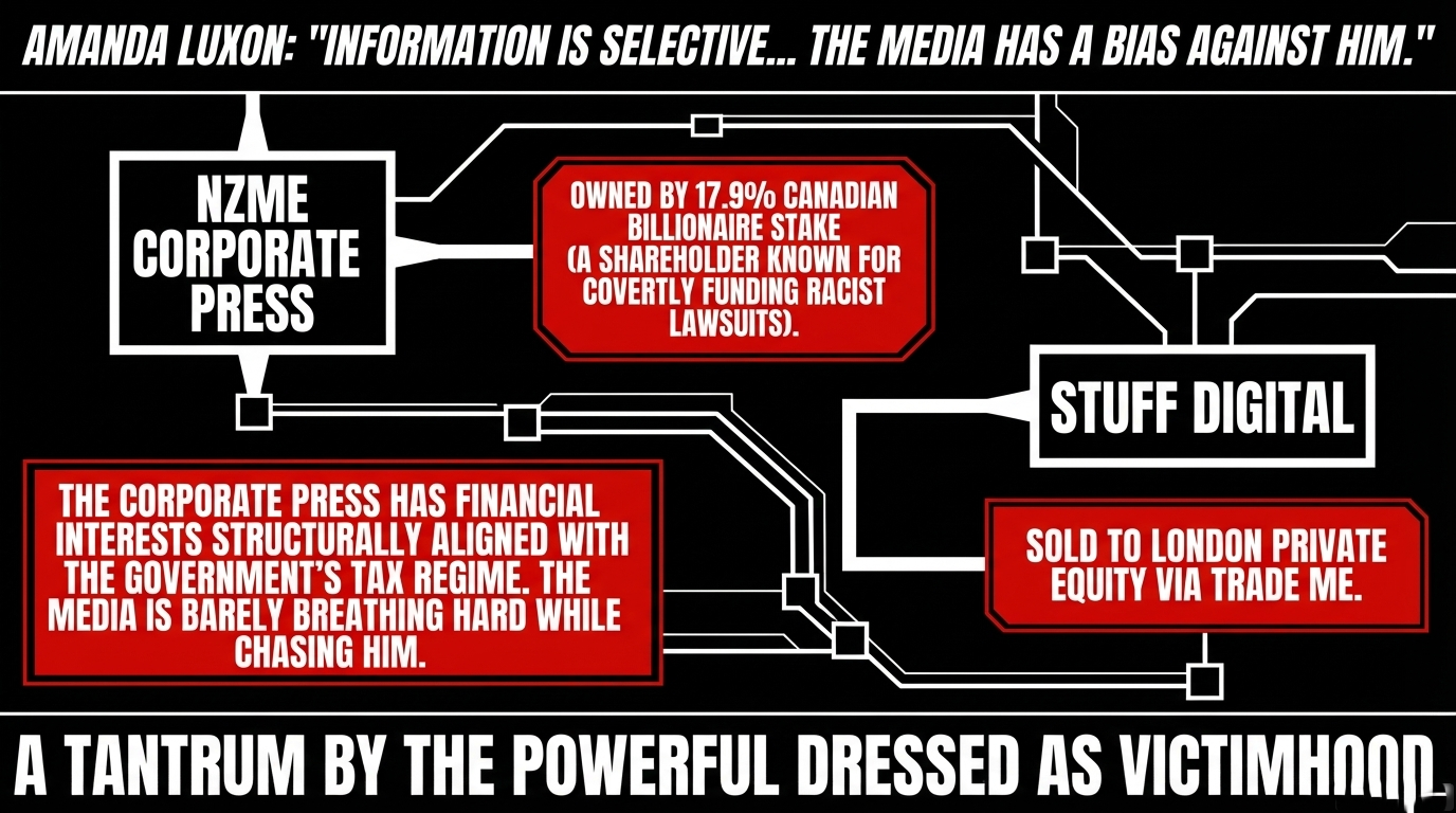 Stuff Digital was sold to London private equity via Trade Me, as confirmed by the JMAD Media Ownership Report. The media isn't hunting Luxon. The media is barely breathing hard while chasing him.